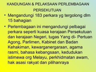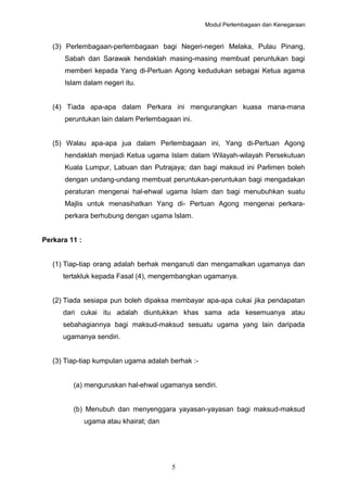 Iii perlembagaan malaysia adalah perlembagaan beraja berasaskan demokrasi berparlimen di mana perkara 32 menjelaskan mengenai kepala utama. Sunday 12 October 2014 PERKARA 3- AGAMA BAGI PERSEKUTUAN ü Islam ialah agama bagi persekutuantetapi agama-agama lainboleh diamalkan dengan aman dan damai di mana mana Bahagian Persekutuan. Keabdian dan kerja paksa perkara 6 perlembagaan persekutuan malaysia memperuntukkan bahawa tidak seorang pun boleh ditahan sebab abdi dan kerja paksa.